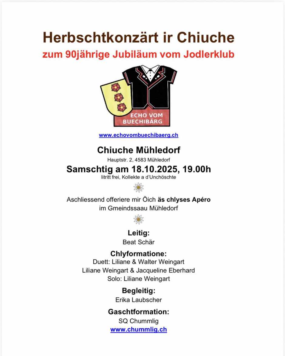 Konzert Jodlerklub Echo vom Buechibärg, Samstag, 18. Oktober, 19 Uhr, Kirche Mühledorf